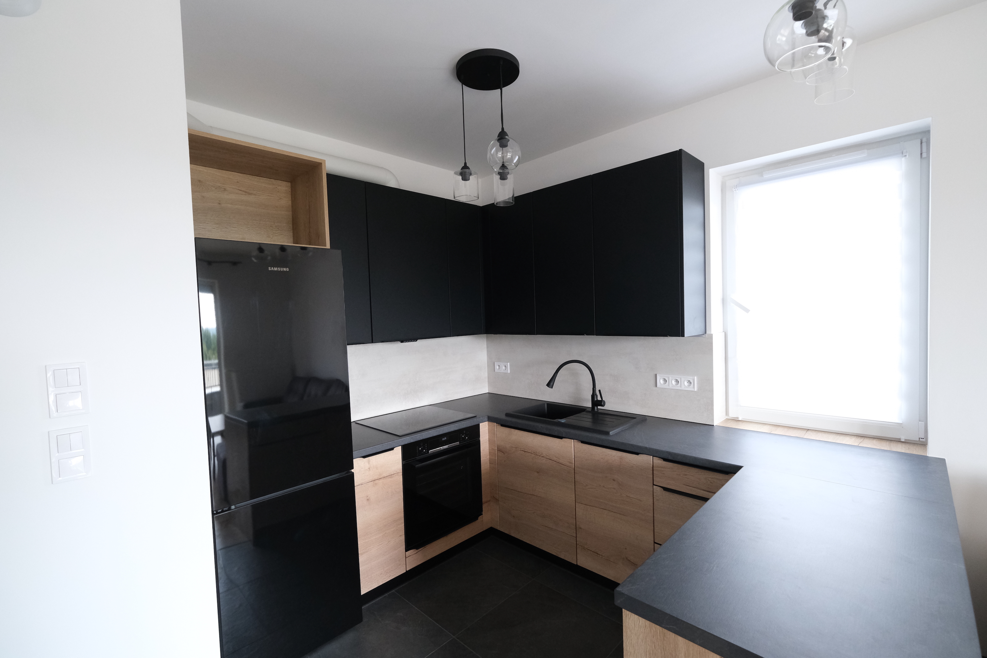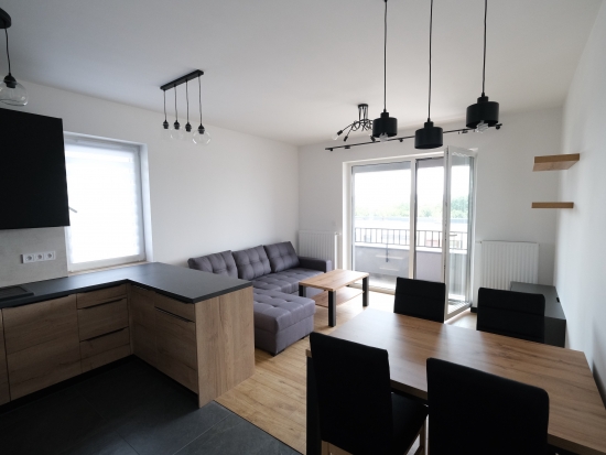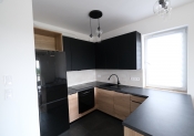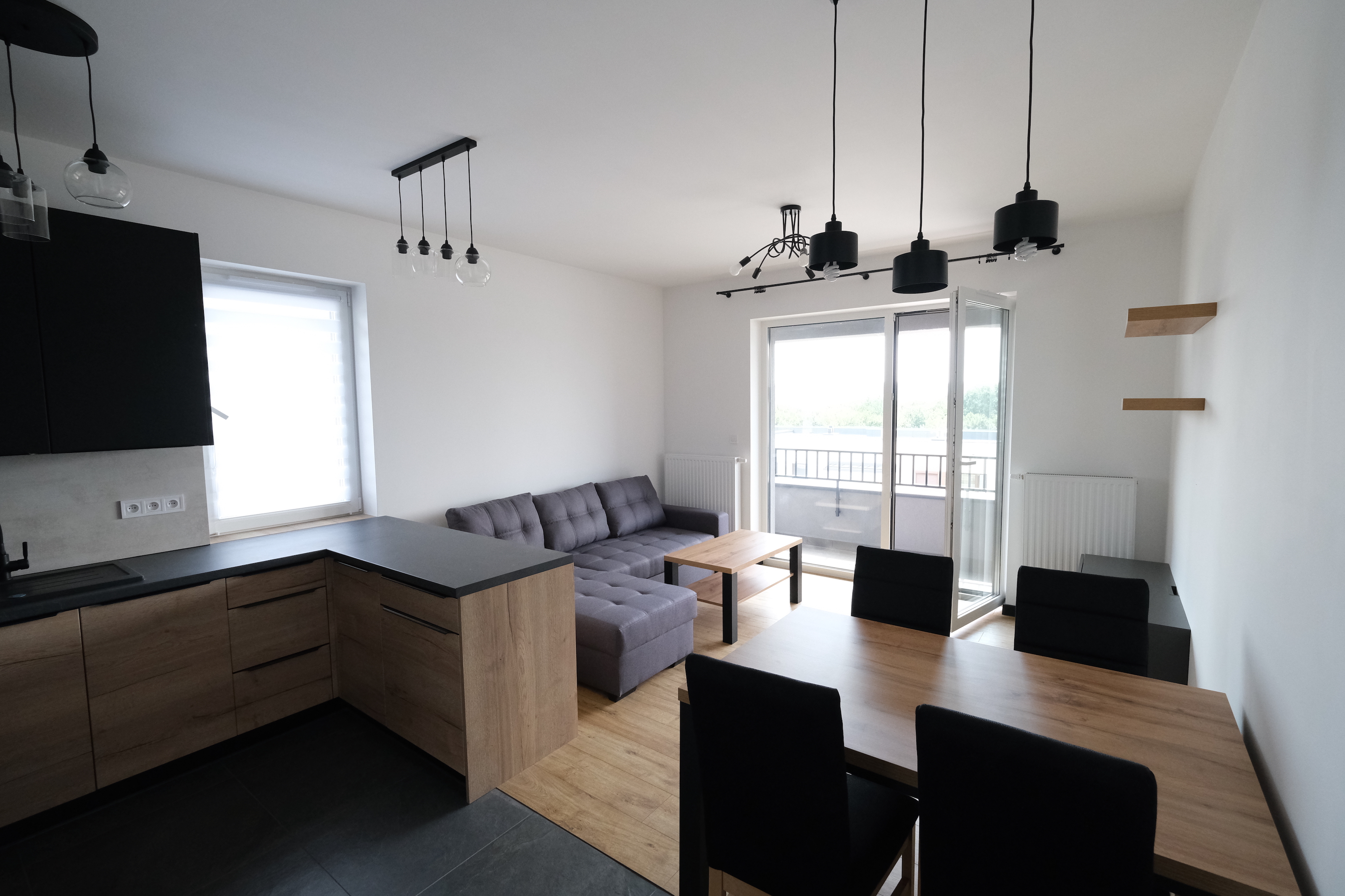 Salon jest bardzo słoneczny i funkcjonalny. Kuchnia wyposażona w nowe grafitowo- drewniane meble oraz sprzęt AGD.