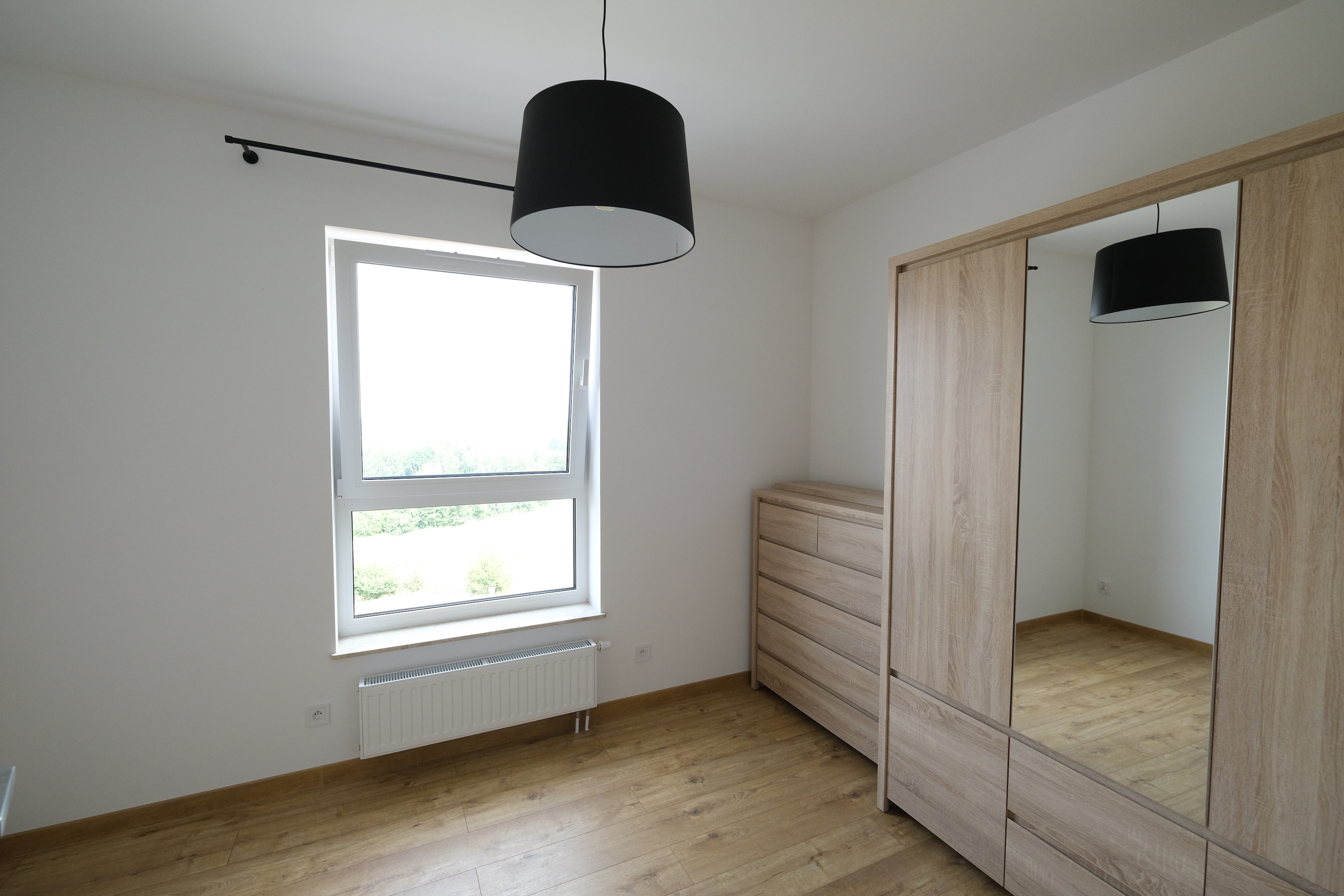 Drugi pokój wyposażony w szafę i komodę drewnianą.