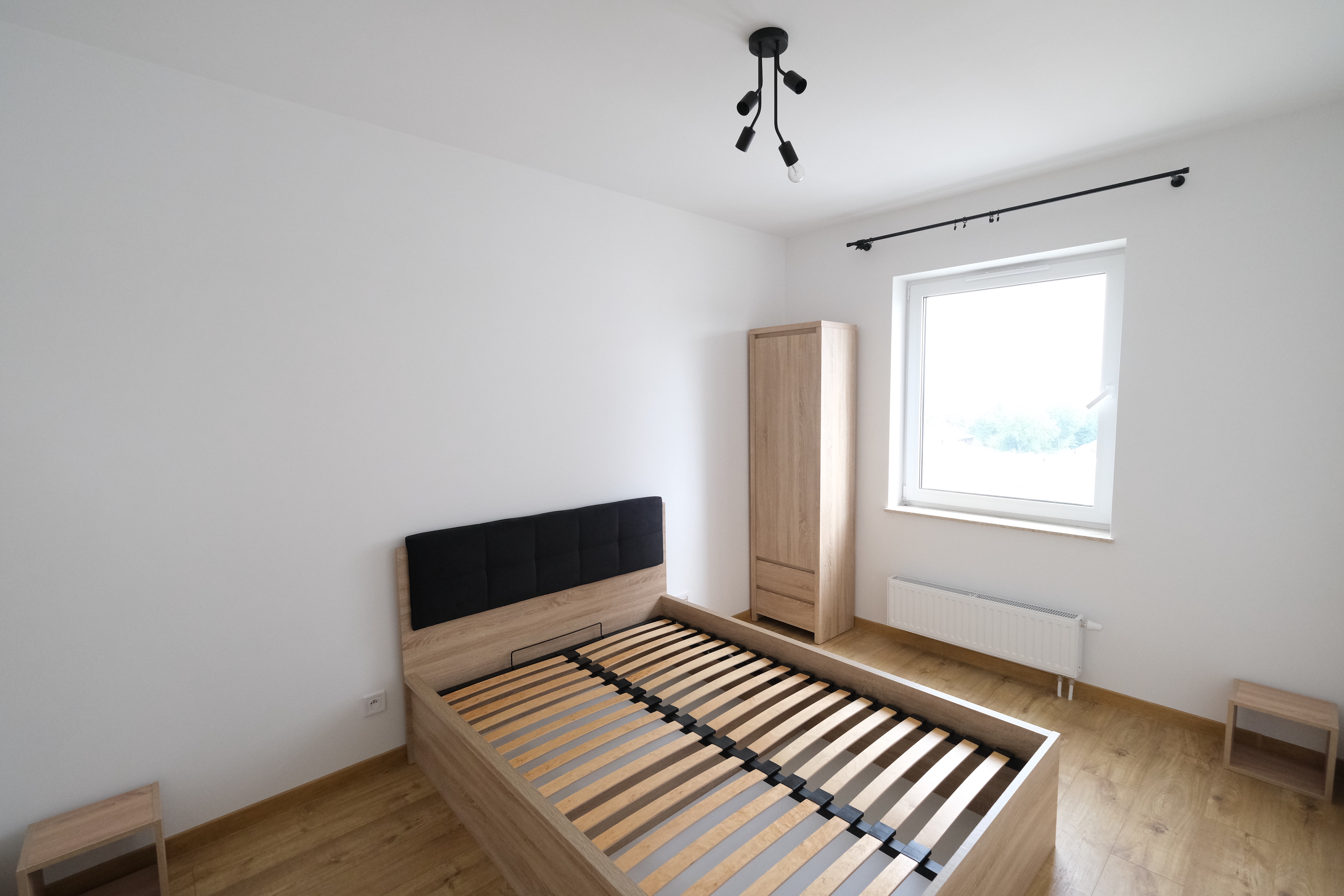 W sypialni duże wygodne łóżko wraz z szafkami nocnymi.